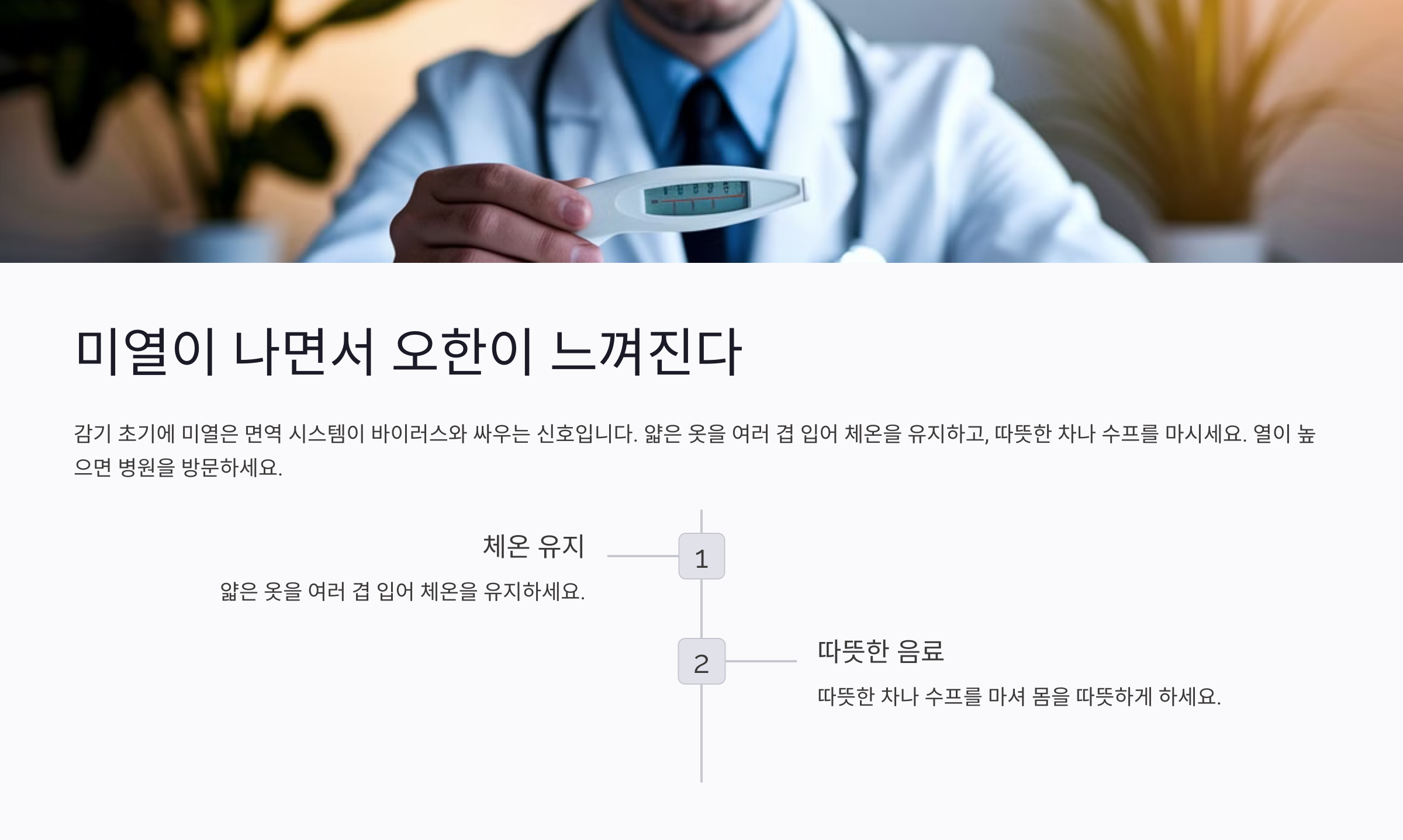 감기는 흔한 질병이지만, 초기에 적절한 조치를 취하면 증상을 완화하고 빠르게 회복할 수 있다. 몸이 보내는 신호를 무시하지 말고 충분한 휴식과 영양 섭취를 통해 면역력을 강화하는 것이 중요하다.