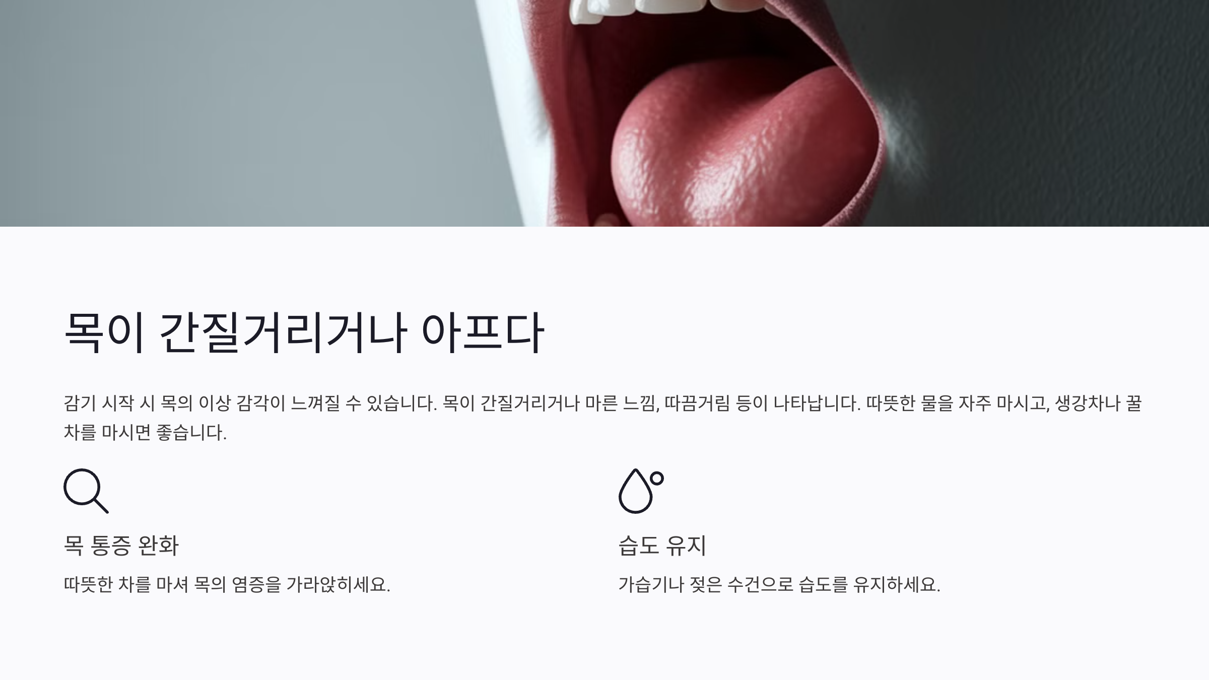 이런 증상이 나타나면 따뜻한 물을 자주 마셔서 목이 건조해지는 것을 막아야 한다. 특히 꿀을 섞은 따뜻한 차나 생강차를 마시면 목의 통증 완화에 도움이 된다. 실내 습도를 적절하게 유지하는 것도 중요하다. 건조한 환경에서는 바이러스가 더 쉽게 퍼질 수 있기 때문에 가습기를 사용하거나 젖은 수건을 걸어두는 것이 좋다.