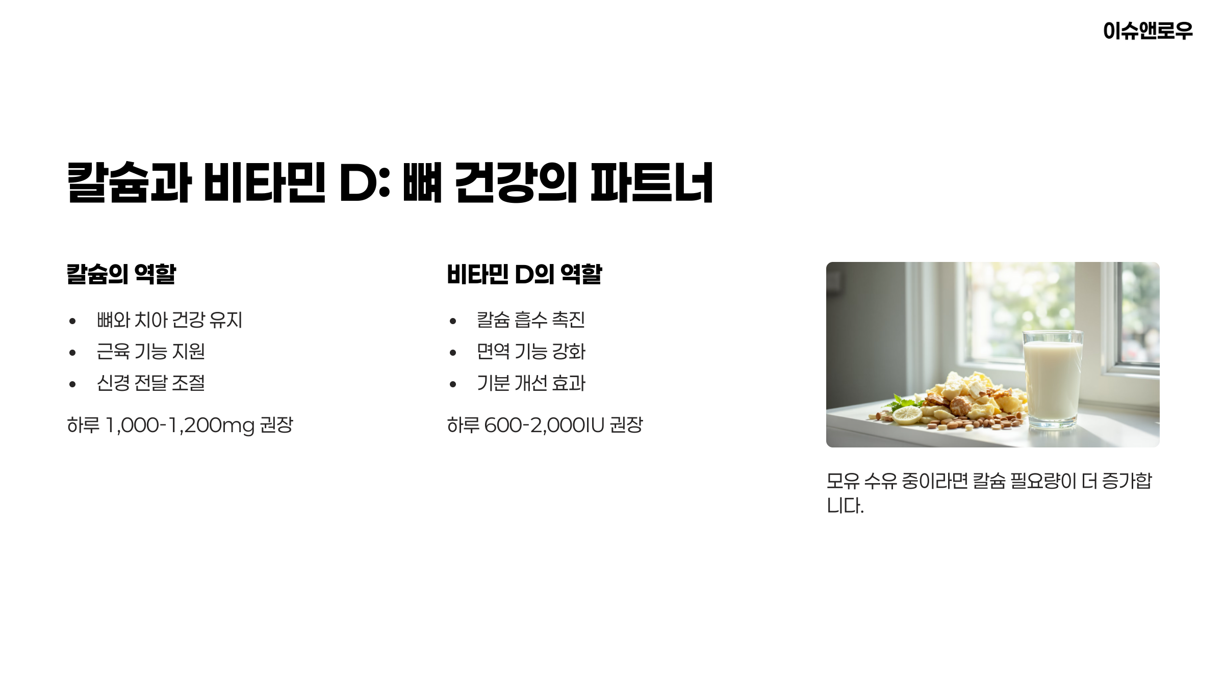 부족하면 1,000~2,000IU 정도 꾸준히 복용하는 게 좋아요.