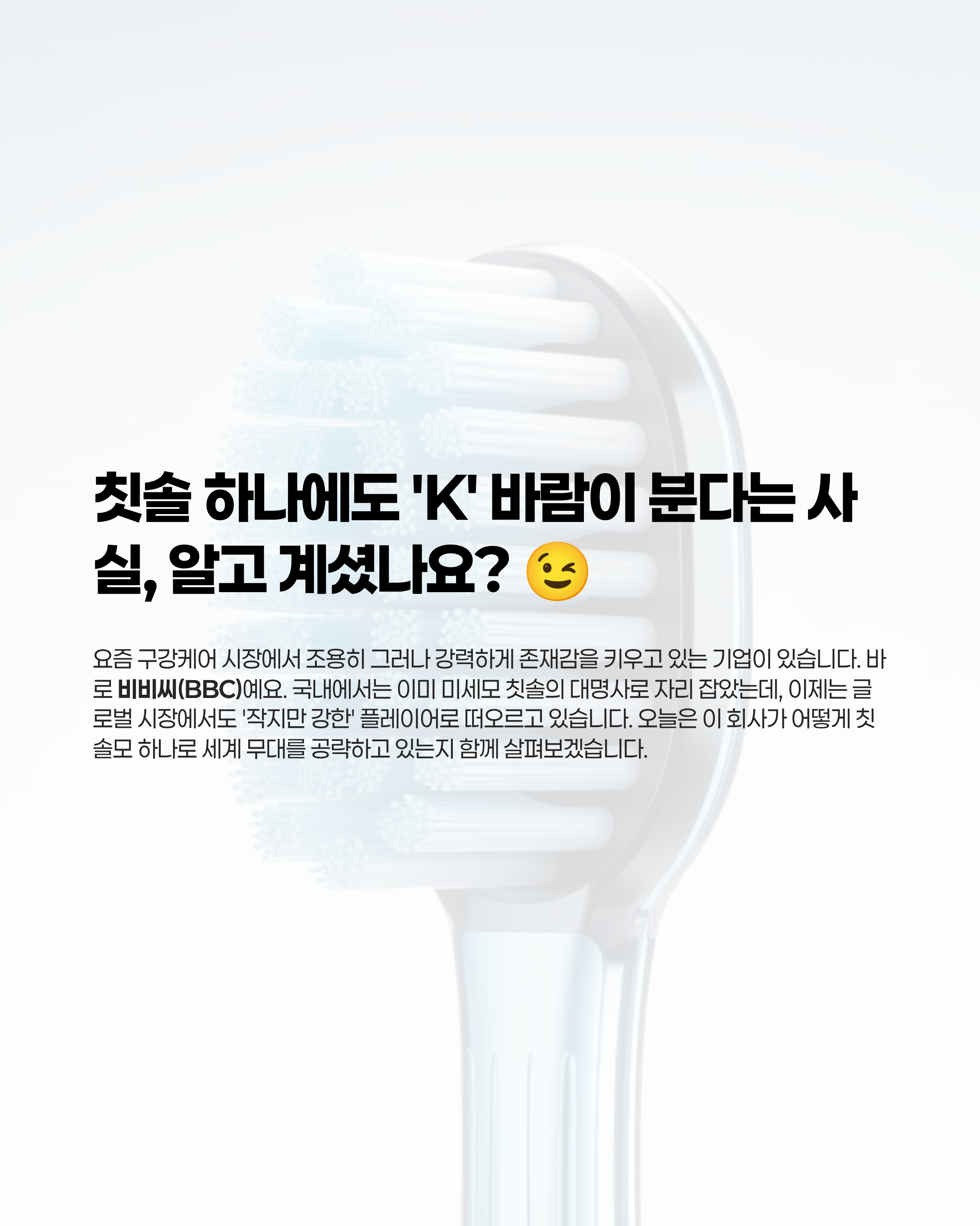 요즘 구강케어 시장에서 조용히 그러나 강력하게 존재감을 키우고 있는 기업이 있습니다. 바로 비비씨(BBC)예요. 국내에서는 이미 미세모 칫솔의 대명사로 자리 잡았는데, 이제는 글로벌 시장에서도 ‘작지만 강한’ 플레이어로 떠오르고 있습니다. 오늘은 이 회사가 어떻게 칫솔모 하나로 세계 무대를 공략하고 있는지 함께 살펴보겠습니다.