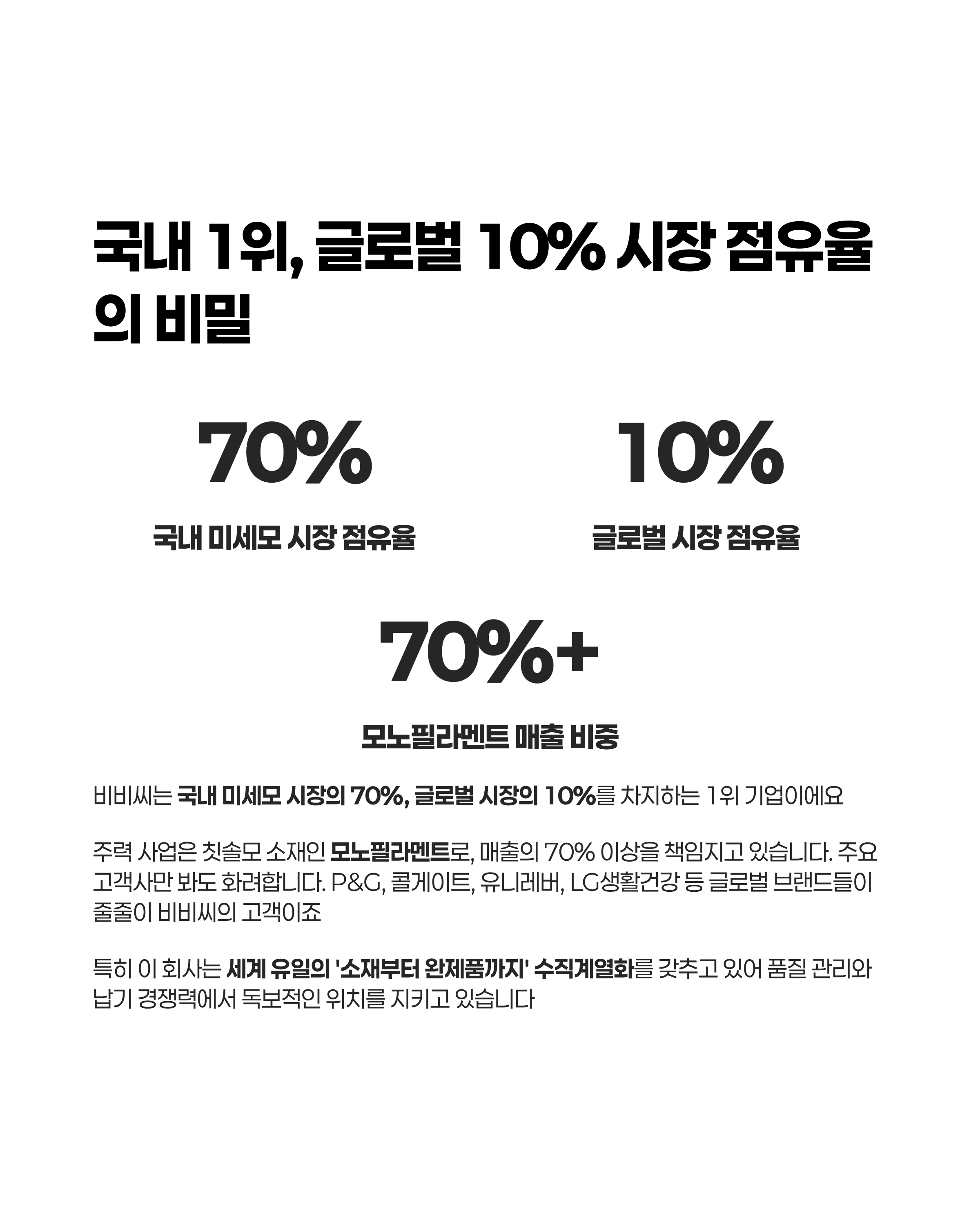 비비씨는 국내 미세모 시장의 70%, 글로벌 시장의 10%를 차지하는 1위 기업이에요