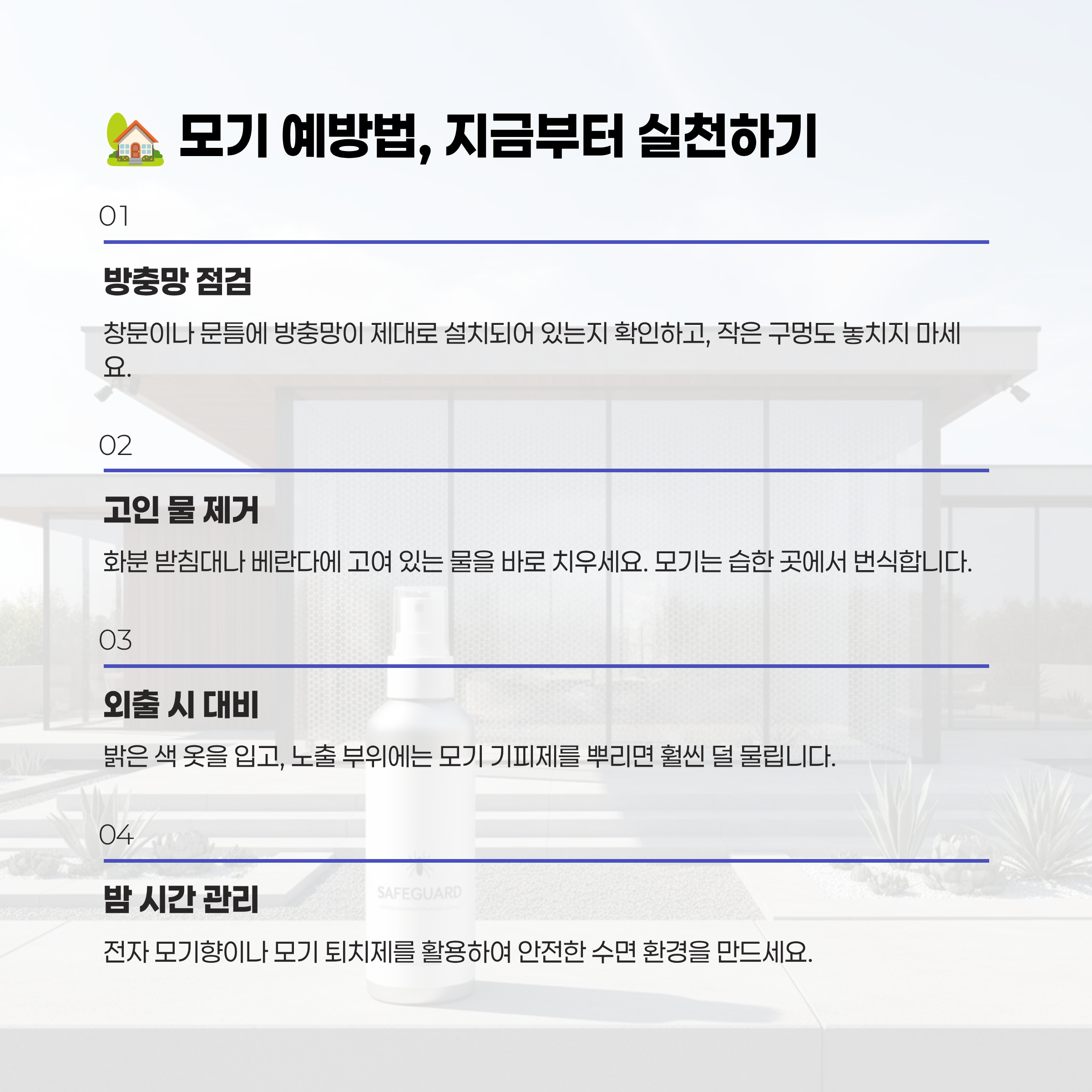 건강을 위해서는 단순히 모기를 피하는 게 아니라, 환경을 관리하고 생활습관을 조금씩 바꾸는 노력이 필요합니다.