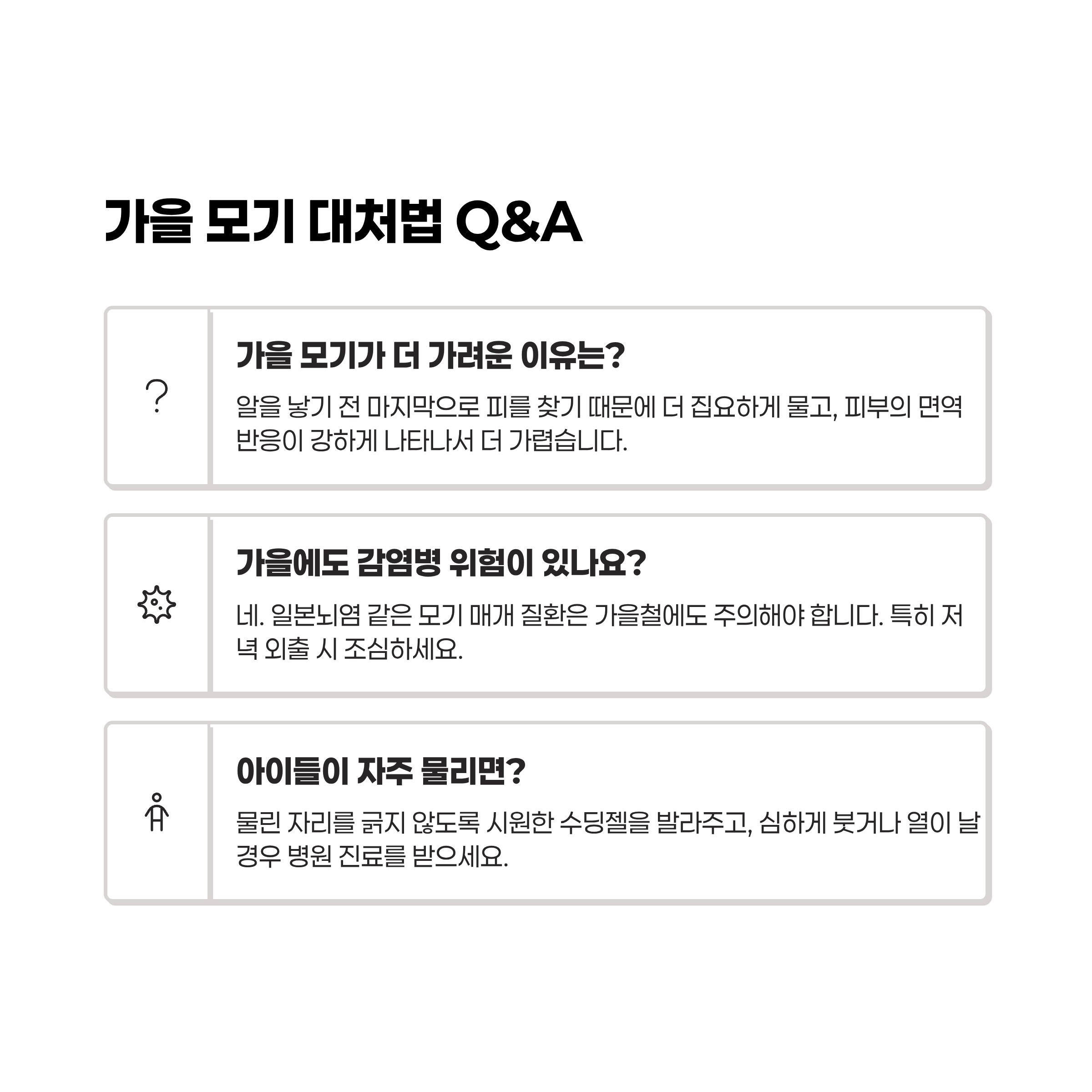 👉 가을 모기는 알을 낳기 전 마지막으로 피를 찾기 때문에 더 집요하게 물고, 피부의 면역 반응이 강하게 나타나서 더 가렵습니다.