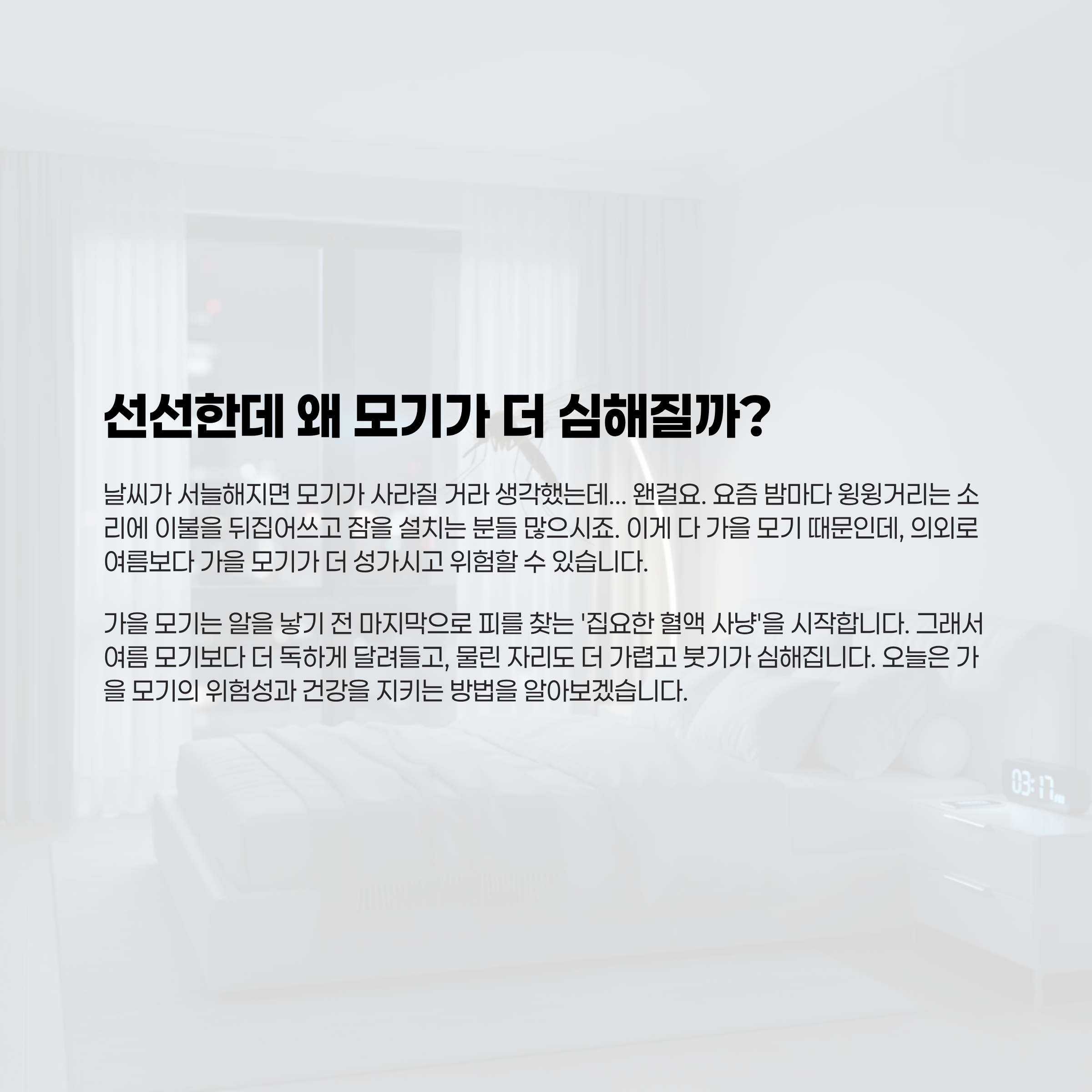 특히 가을 모기는 집요하고 강하기 때문에 가볍게 넘기면 안 되죠.