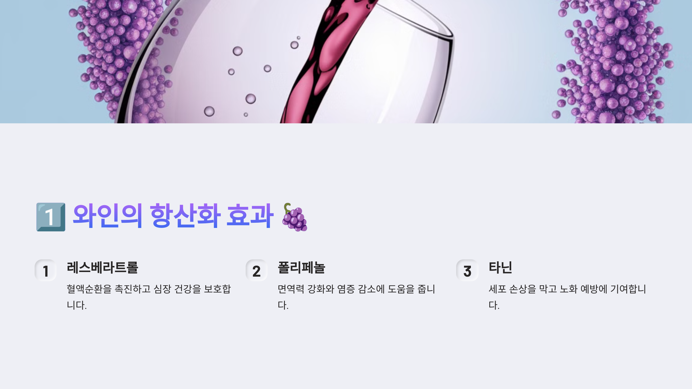 - 레드 와인: 항산화 효과 & 심장 건강에 도움