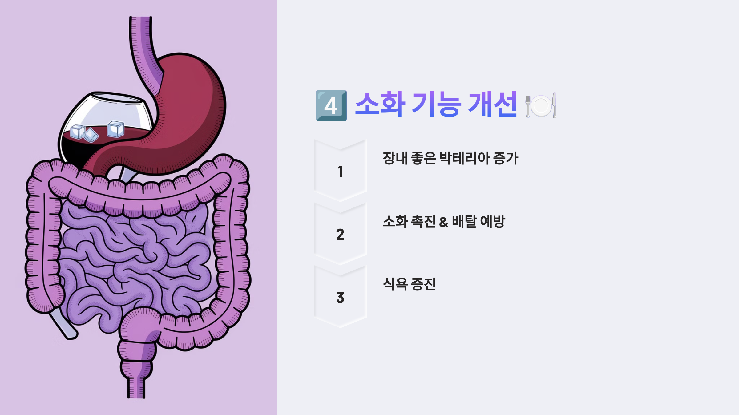 와인은 위산 분비를 촉진하고, 장내 유익균을 증가시키는 효과가 있어요.