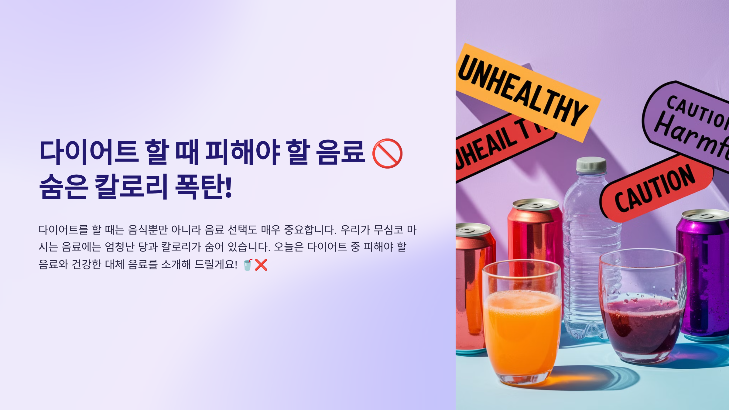 다이어트에서 가장 중요한 것은 "음료도 음식만큼 신경 써야 한다"는 점이에요. 무심코 마시는 한 잔이 다이어트를 방해할 수 있으니, 오늘부터 건강한 음료로 바꿔보는 건 어떨까요? 💪