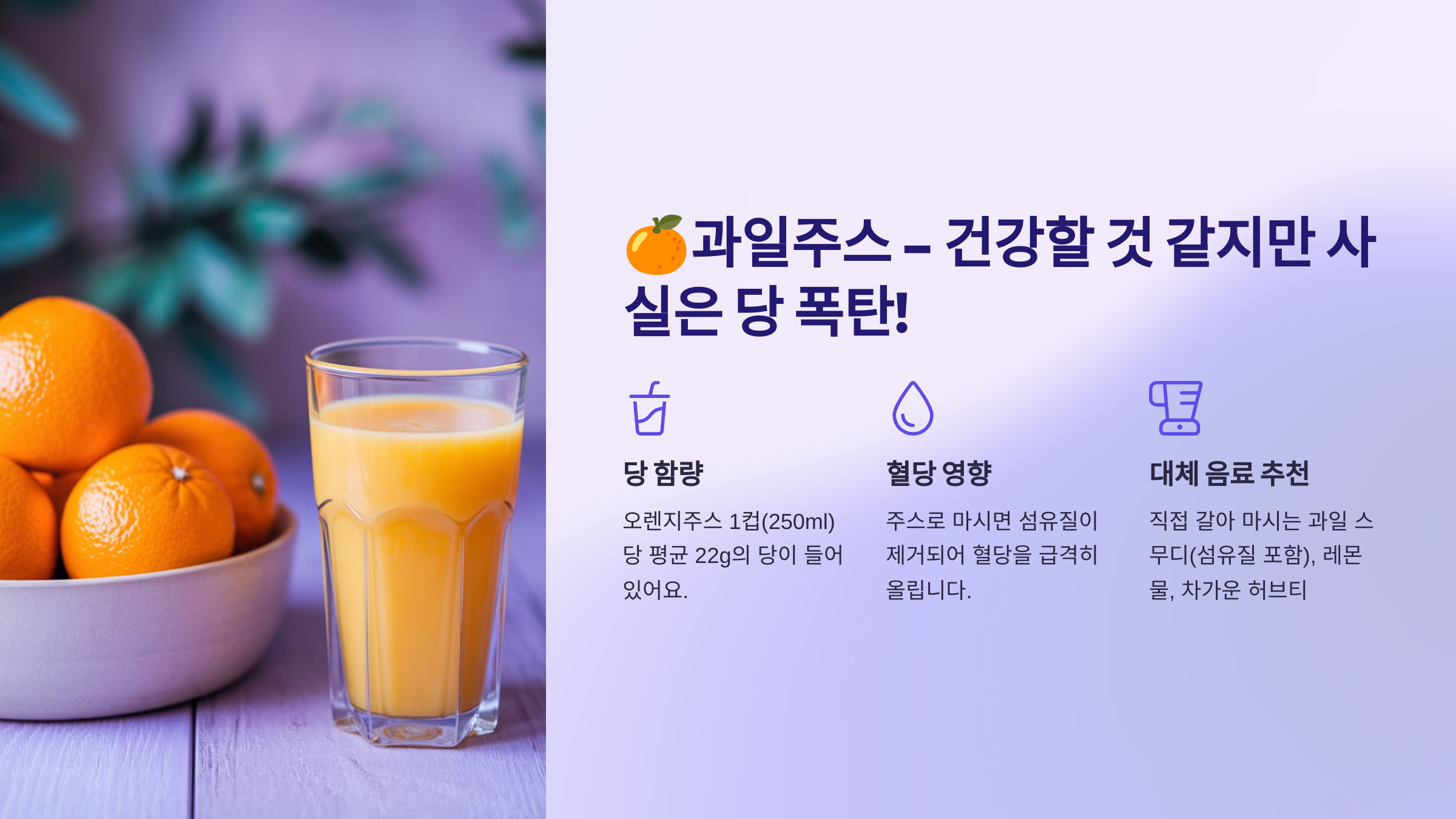 과일을 통째로 먹을 때는 섬유질이 있어 당 흡수를 천천히 도와주지만, 주스로 마시면 섬유질이 제거되어 혈당을 급격히 올립니다.