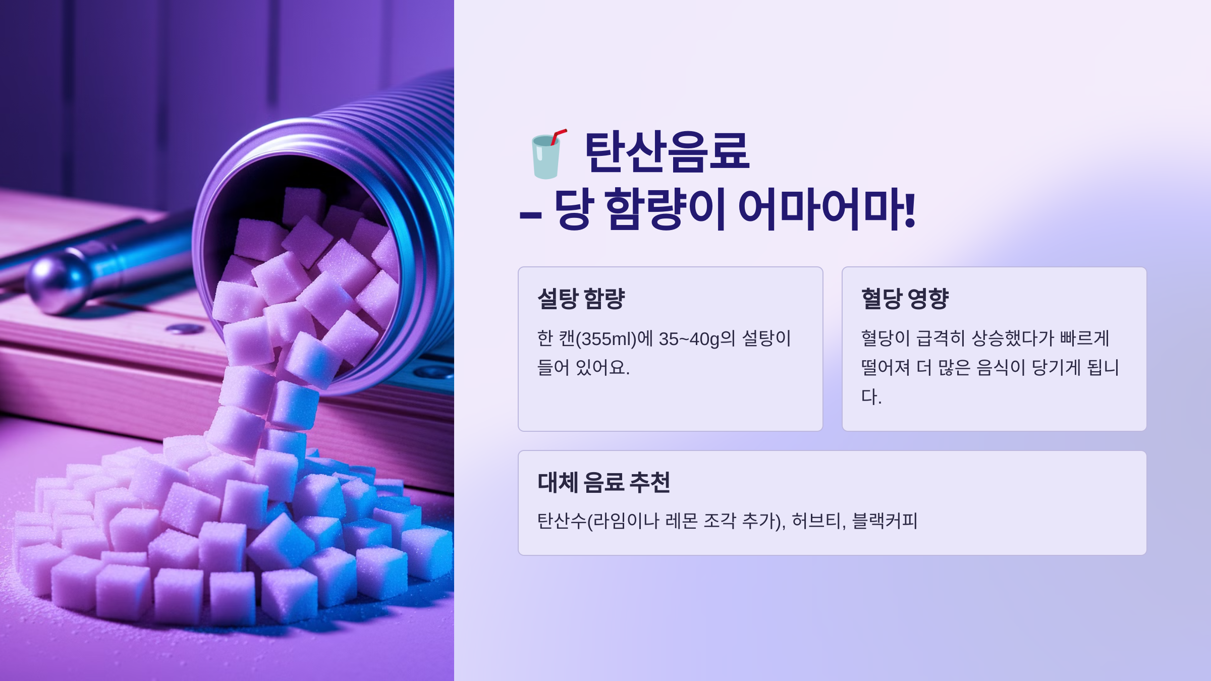 콜라, 사이다 같은 탄산음료는 다이어트의 가장 큰 적 중 하나입니다. 😱 한 캔(355ml)에 35~40g의 설탕이 들어 있어, 한 번만 마셔도 하루 당 섭취 권장량을 초과할 수 있어요.