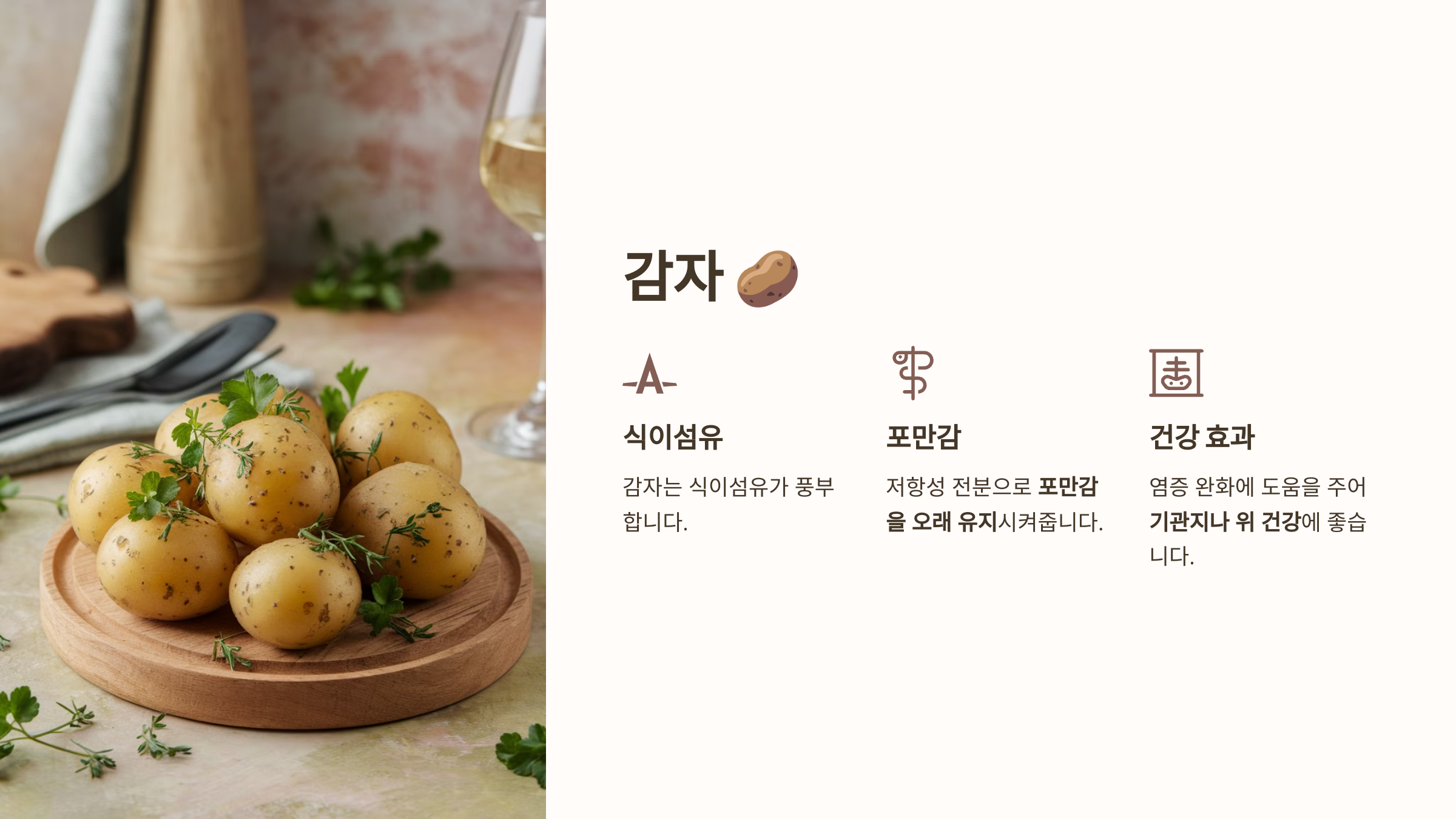 감자는 식이섬유가 풍부하고, 특히 삶았을 때 전분이 저항성 전분으로 변하여 포만감을 오래 유지시켜줍니다. 또한, 염증 완화에 도움을 줄 수 있어 기관지나 위 건강에도 좋은 영향을 줍니다.