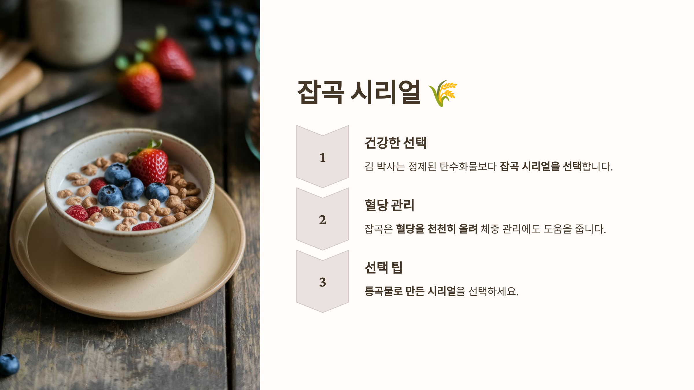 김 박사는 정제된 탄수화물보다 잡곡 시리얼을 선택합니다. 잡곡은 혈당을 천천히 올려 체중 관리에도 도움을 줍니다.