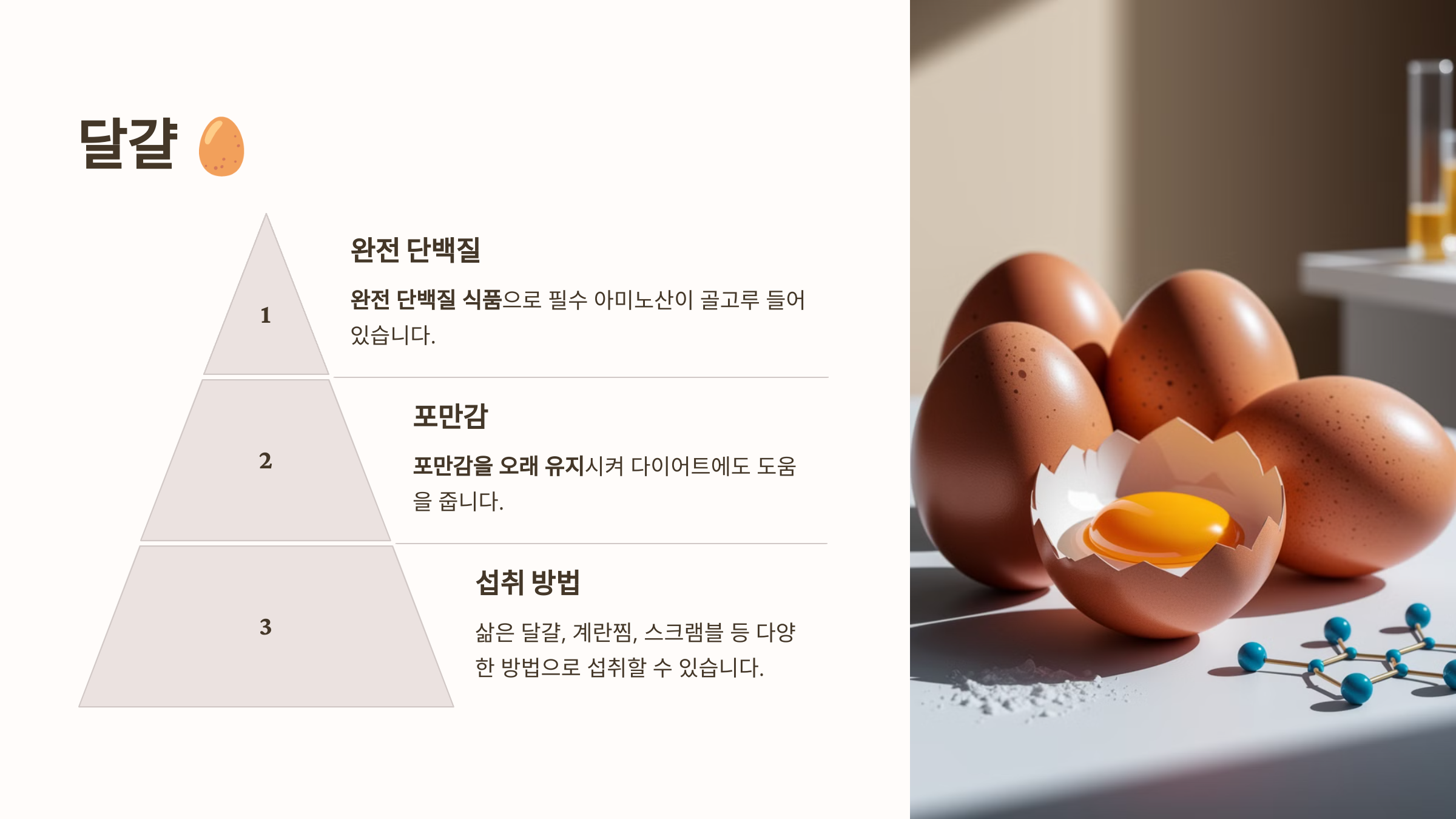 달걀은 완전 단백질 식품으로 불릴 만큼 필수 아미노산이 골고루 들어 있습니다. 특히 포만감을 오래 유지시켜 다이어트에도 도움을 줍니다.