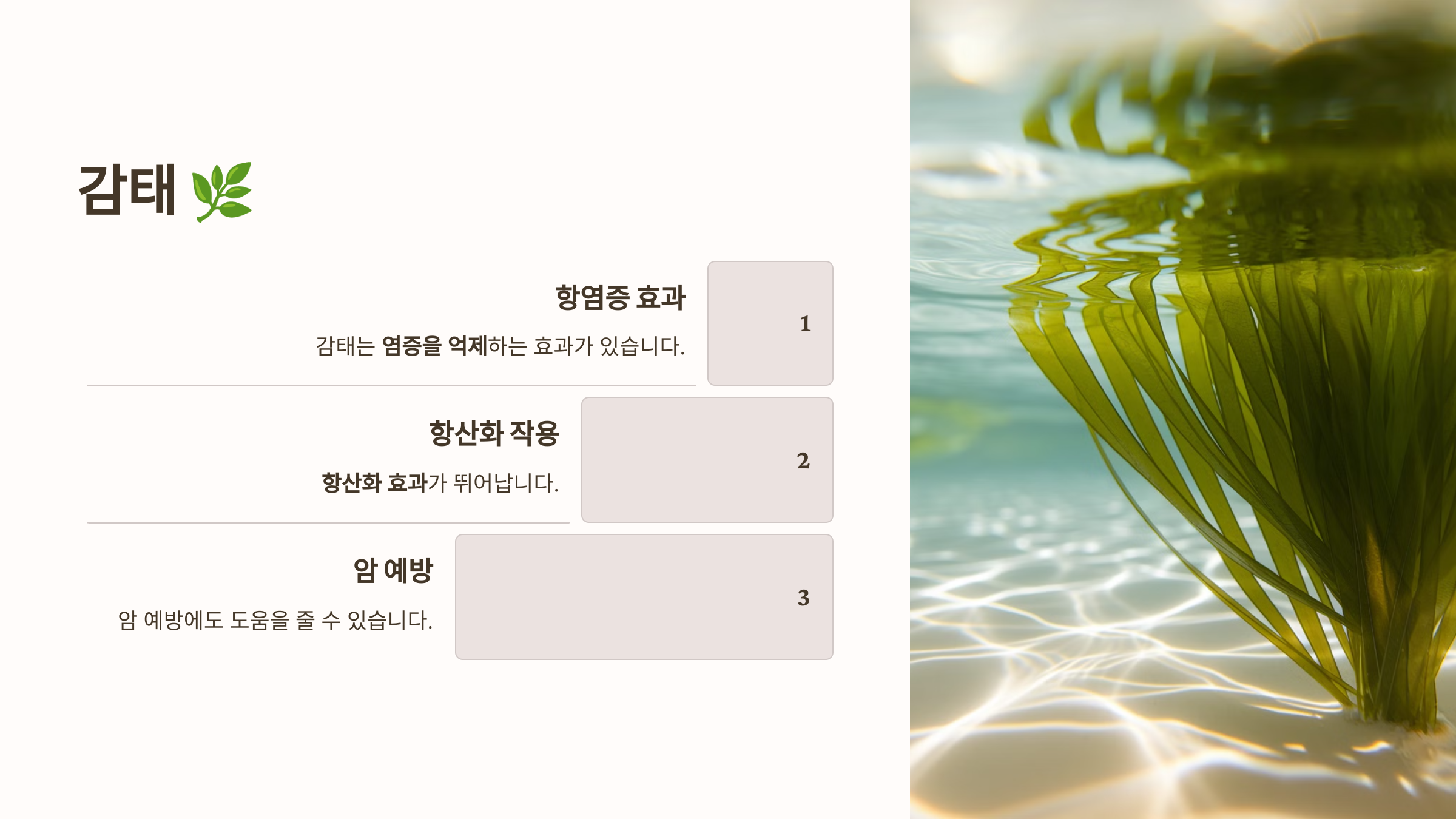 김 박사가 특히 강조한 식품 중 하나가 감태입니다. 감태는 염증을 억제하고 항산화 효과가 뛰어나 암 예방에도 도움을 줄 수 있습니다.