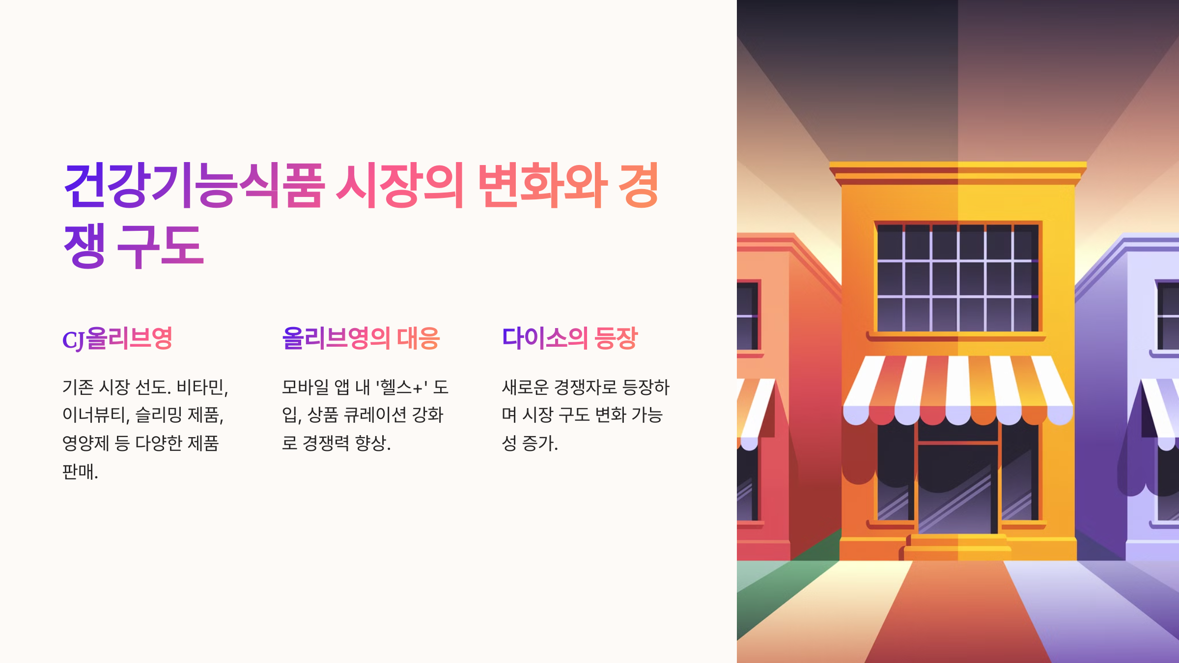기존 건강기능식품 시장은 CJ올리브영이 선도하고 있었습니다. 올리브영은 비타민, 이너뷰티, 슬리밍 제품, 영양제 등을 다양하게 판매하며 시장을 장악하고 있었는데요.