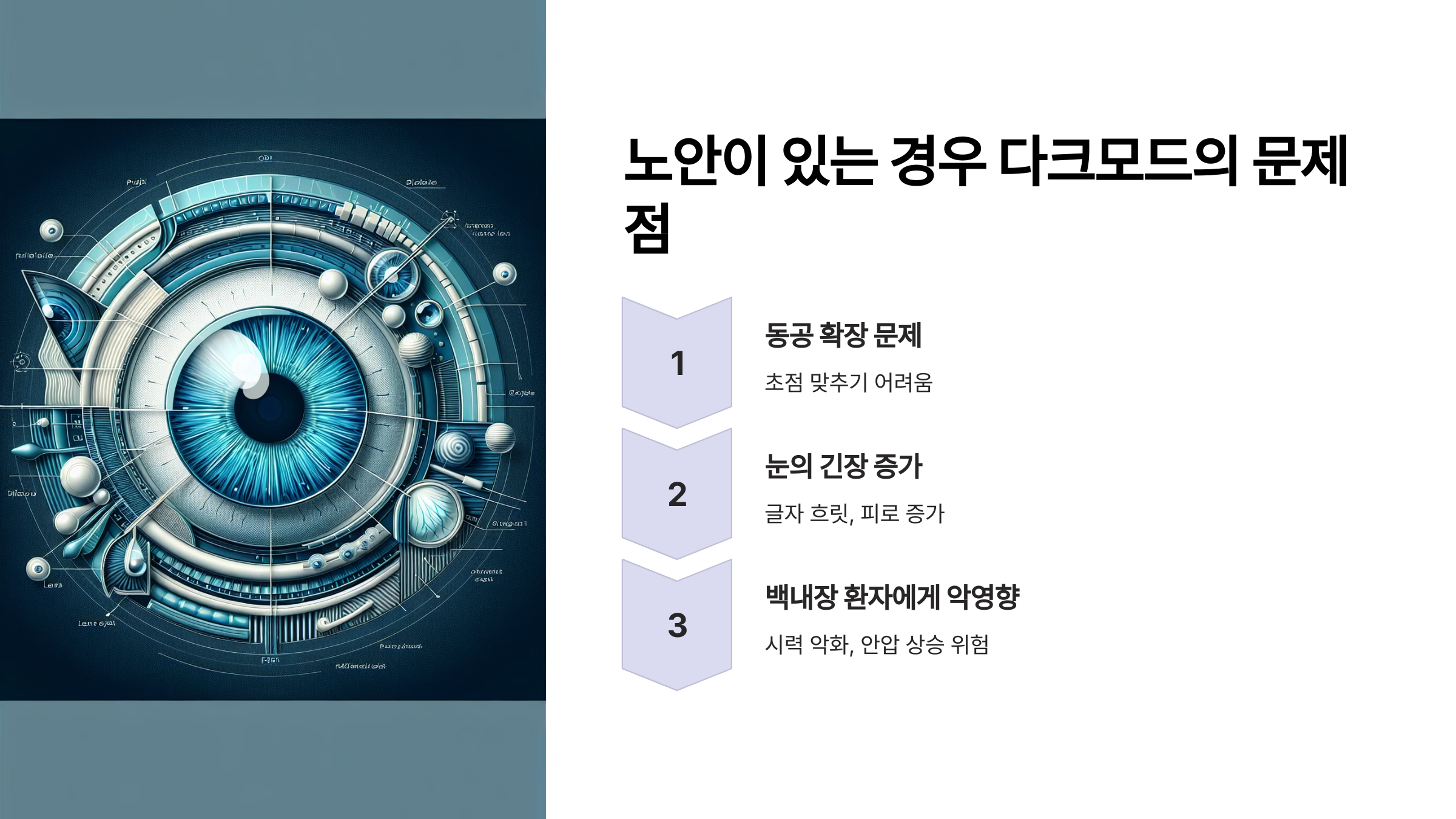 특히, 다크모드가 노안이나 백내장이 있는 사람들에게는 오히려 피로감을 증가시킬 수 있다는 연구 결과도 있습니다.