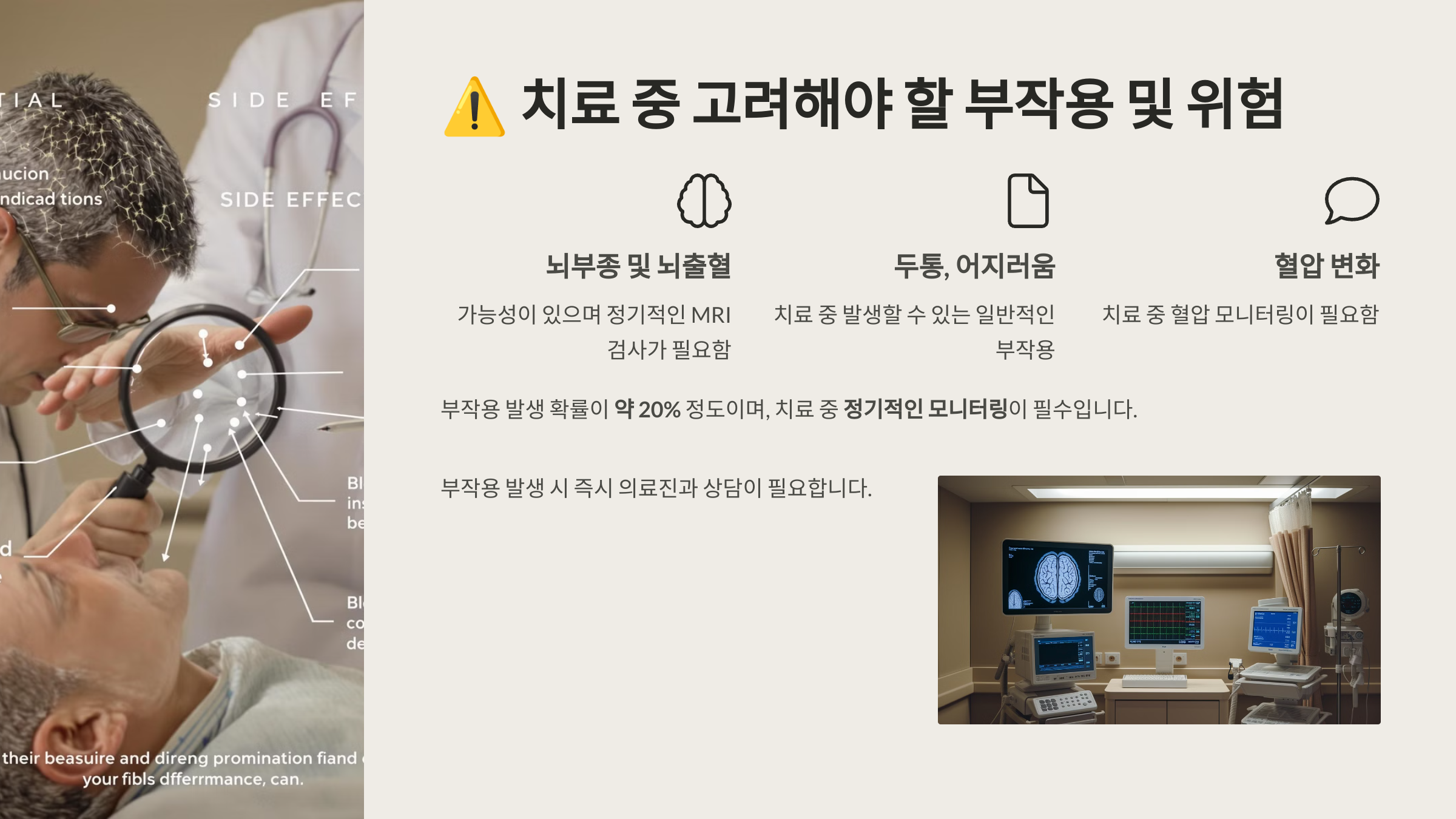 A2. 정기적인 MRI 검사를 통해 뇌출혈 여부를 확인하며, 심한 부작용이 발생하면 치료를 중단할 수도 있습니다.
