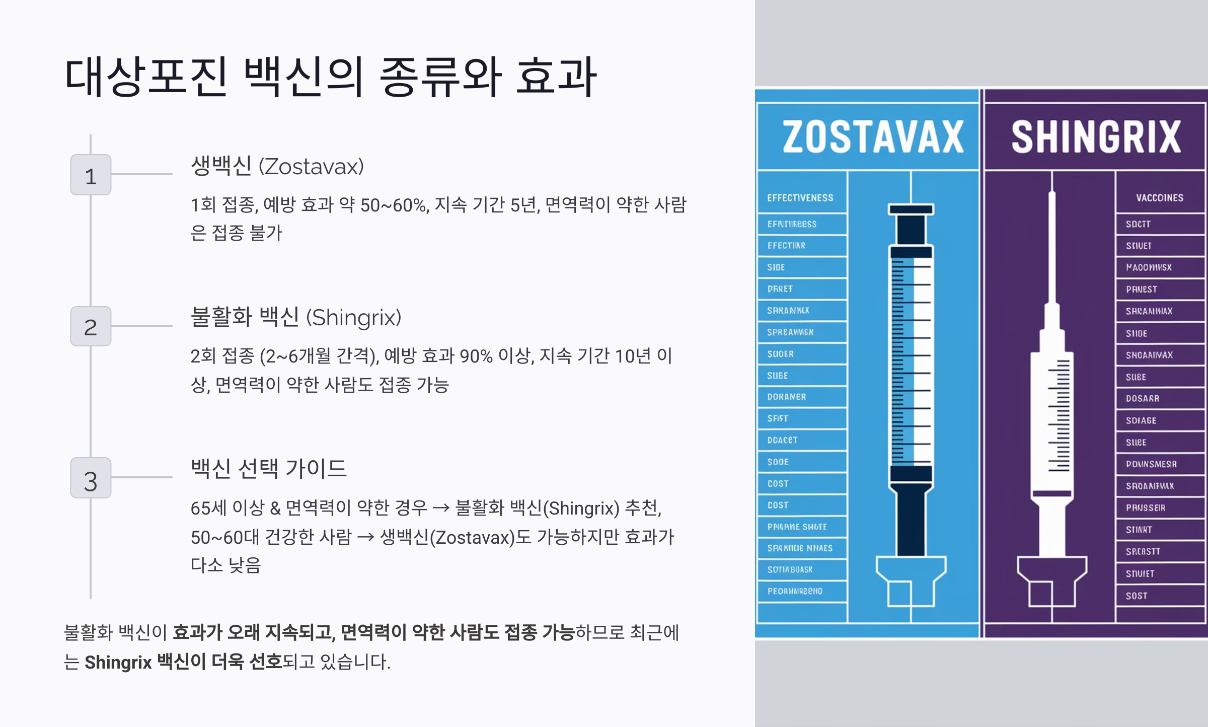 🔹 어떤 백신을 선택해야 할까? ✅ 65세 이상 & 면역력이 약한 경우 → 불활화 백신(Shingrix) 추천