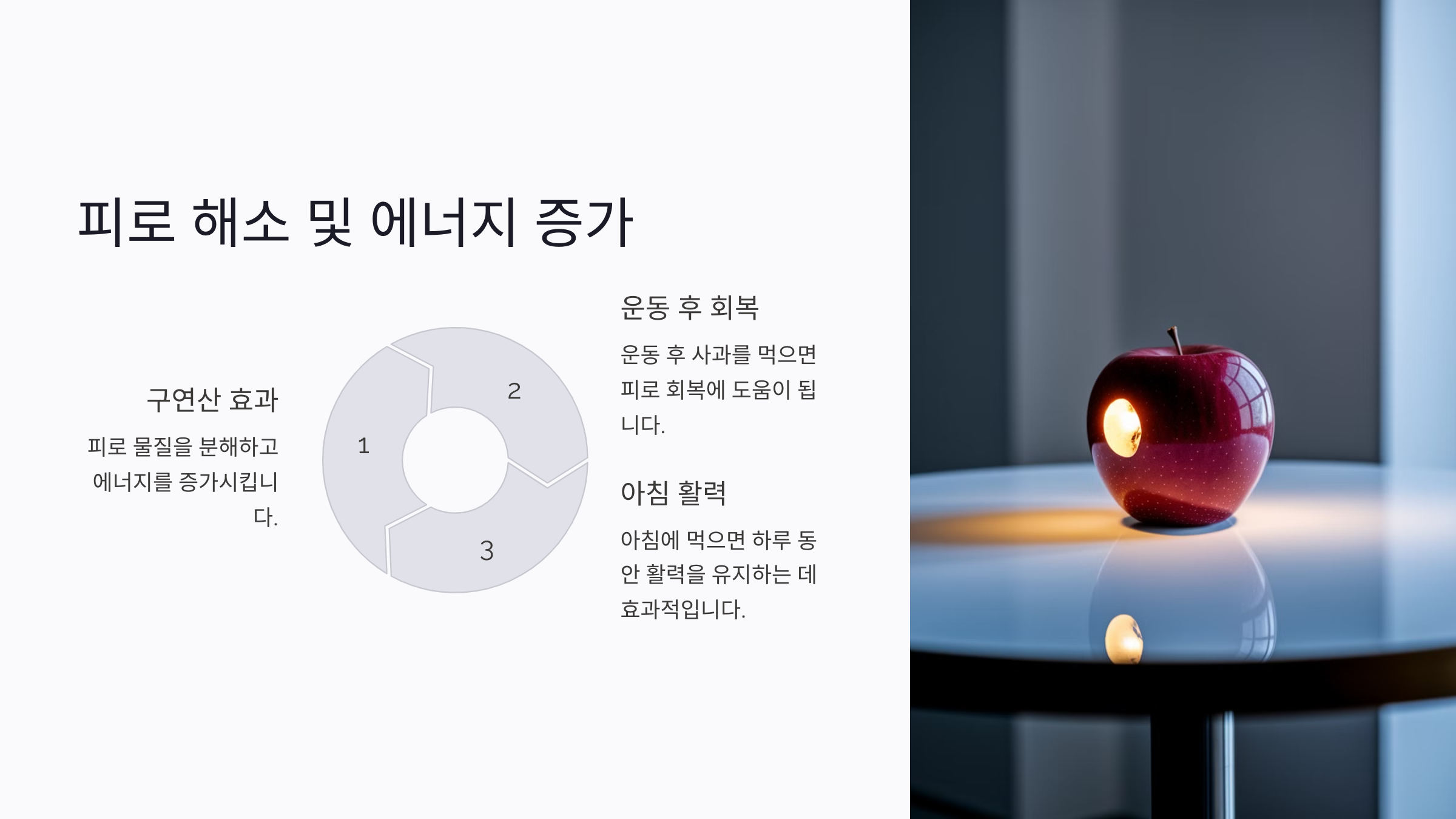 사과의 신맛을 내는 성분인 구연산은 피로 물질을 분해하고 에너지를 증가시키는 역할을 합니다.