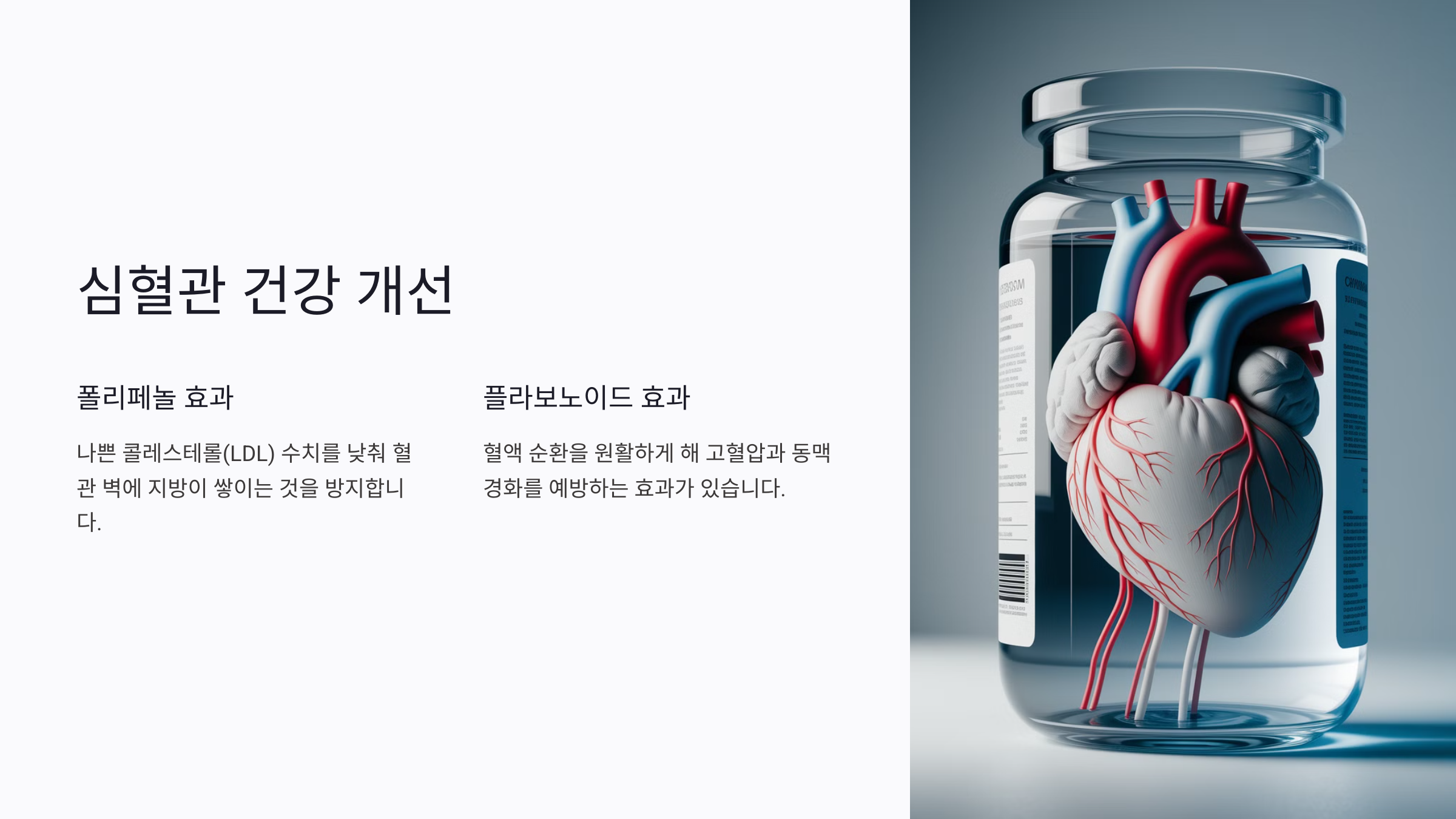 - 폴리페놀은 나쁜 콜레스테롤(LDL) 수치를 낮춰 혈관 벽에 지방이 쌓이는 것을 방지하고,