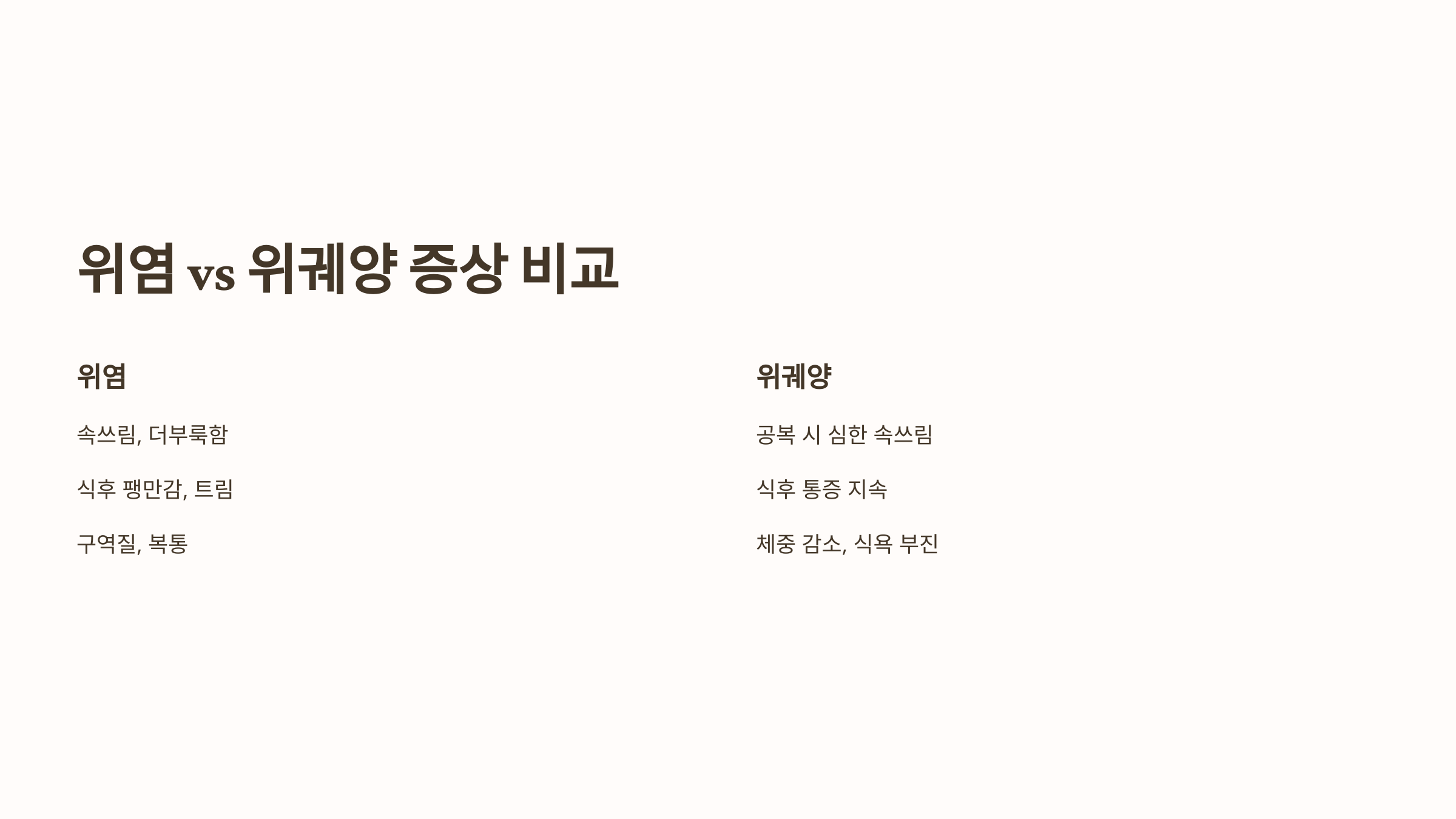 | 증상 | 상복부 불편감, 속 쓰림, 구역감, 소화불량, 가스 참 | 심한 속 쓰림, 공복 시 통증, 식후 통증, 구토, 출혈(심할 경우 흑색 변) |